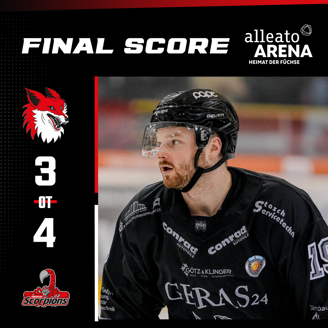 Im Schlussdrittel entwickelt sich ein intensiver Fight auf Augenhöhe. Nach dem zwischenzeitlichen Ausgleich schlägt Philip Kuschel zurück und stellt auf 3:2 für die Füchse. Alles sieht nach einem Heimsieg aus, ehe die Scorpions 2 Sekunden vor der Schlusssirene den Ausgleich erzielen und das Spiel in die Overtime zwingen.