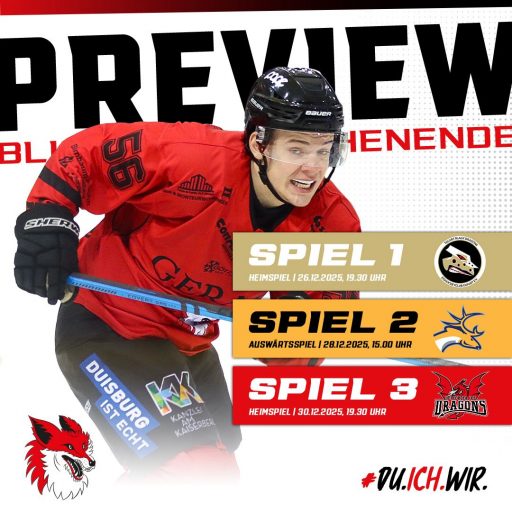 Am 2. Weihnachtsfeiertag empfangen wir die Black Dragons Erfurt (19.30Uhr), am Sonntag geht es mit 4 Fanbussen nach Tilburg (15.00Uhr) und am Dienstag empfangen wir zum Jahresabschluss die Ice Dragons Herford (19.30 Uhr).