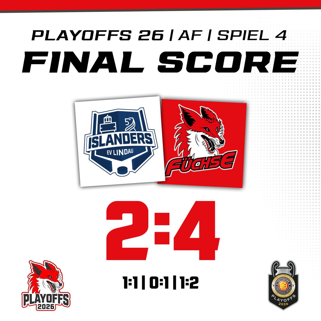 Trotz kurzer Bank und frühem Rückstand ziehen die Füchse dank einer geschlossenen Teamleistung ins Viertelfinale der Playoffs ein. Die Tore erzielten Philippe Sanche, Sandis Zolmanis, Erek Virch und Carter Popoff. Grandios, Männer! 🔥💪🏻