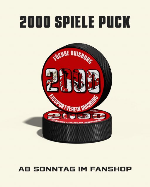 Zum Jubiläum der Füchse Duisburg erscheint ein ganz besonderer Fanartikel: der offizielle „2000 Spiele Puck“. Er steht für 2000 absolvierte Spiele, viele emotionale Momente und die lange Geschichte des Eishockeys in Duisburg.