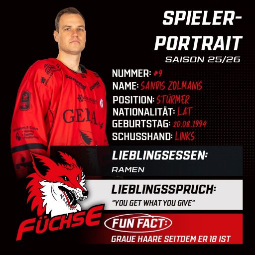 Heute im Fokus: unsere Nummer #9, Stürmer Sandis Zolmanis. Der erfahrene Lette hat in mehreren Ländern gespielt, internationale Erfahrung gesammelt und in der Oberliga bereits bewiesen, dass er ein absoluter Topscorer sein kann. Nun will er seine Stärken im Füchse-Trikot einbringen.